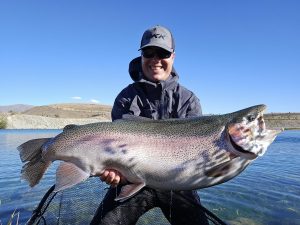 Björn with giant rainbow trout from the canals, 15 KG, about 100cm, river, south island, NZ